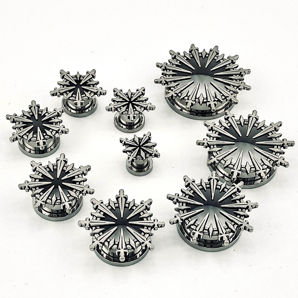 Iron Halo tunnels combine the elegance of steel with the raw symbolism of protection and strength. Their radiant pattern resembles a shield – an amulet for those who aren’t afraid to shine even in the shadows.
